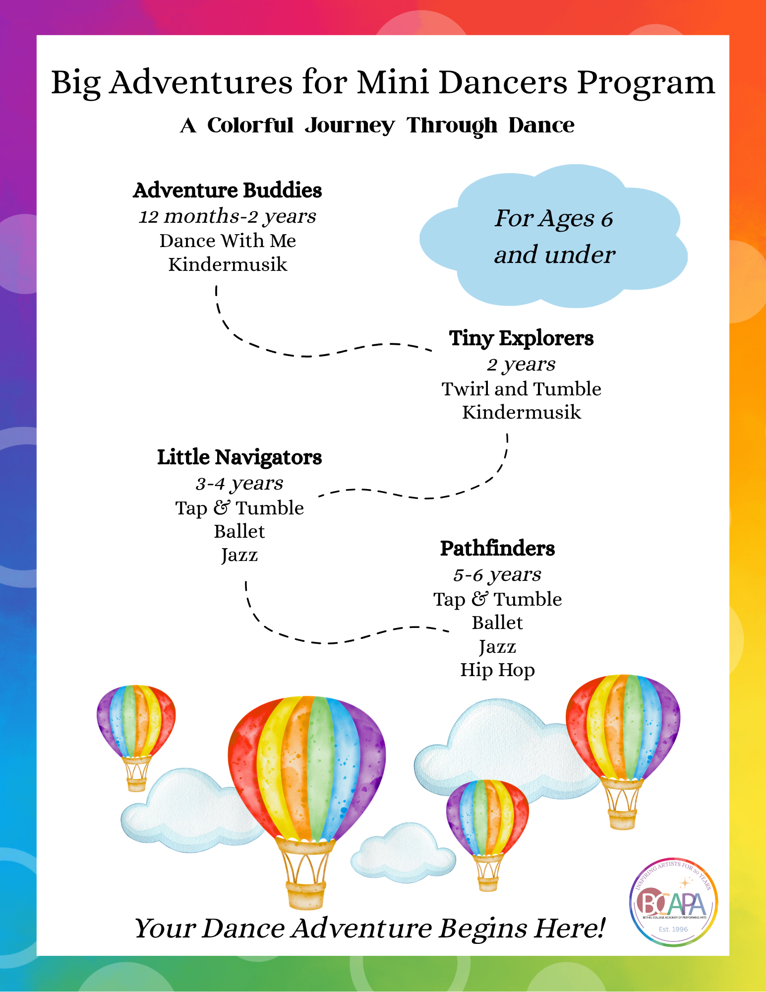 Big Adventures for Mini Dancers is our playful, imagination-filled dance curriculum designed just for ages 6 and under. Each level of the program has been carefully curated to support your child’s growth through engaging activities that focus on listening skills, building friendships, and exploring creativity through dance and movement.